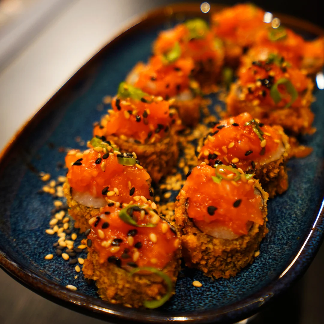 Hot filadelfia com cobertura de tataki de salmão, cream cheese, cebolinha e gerlegim.