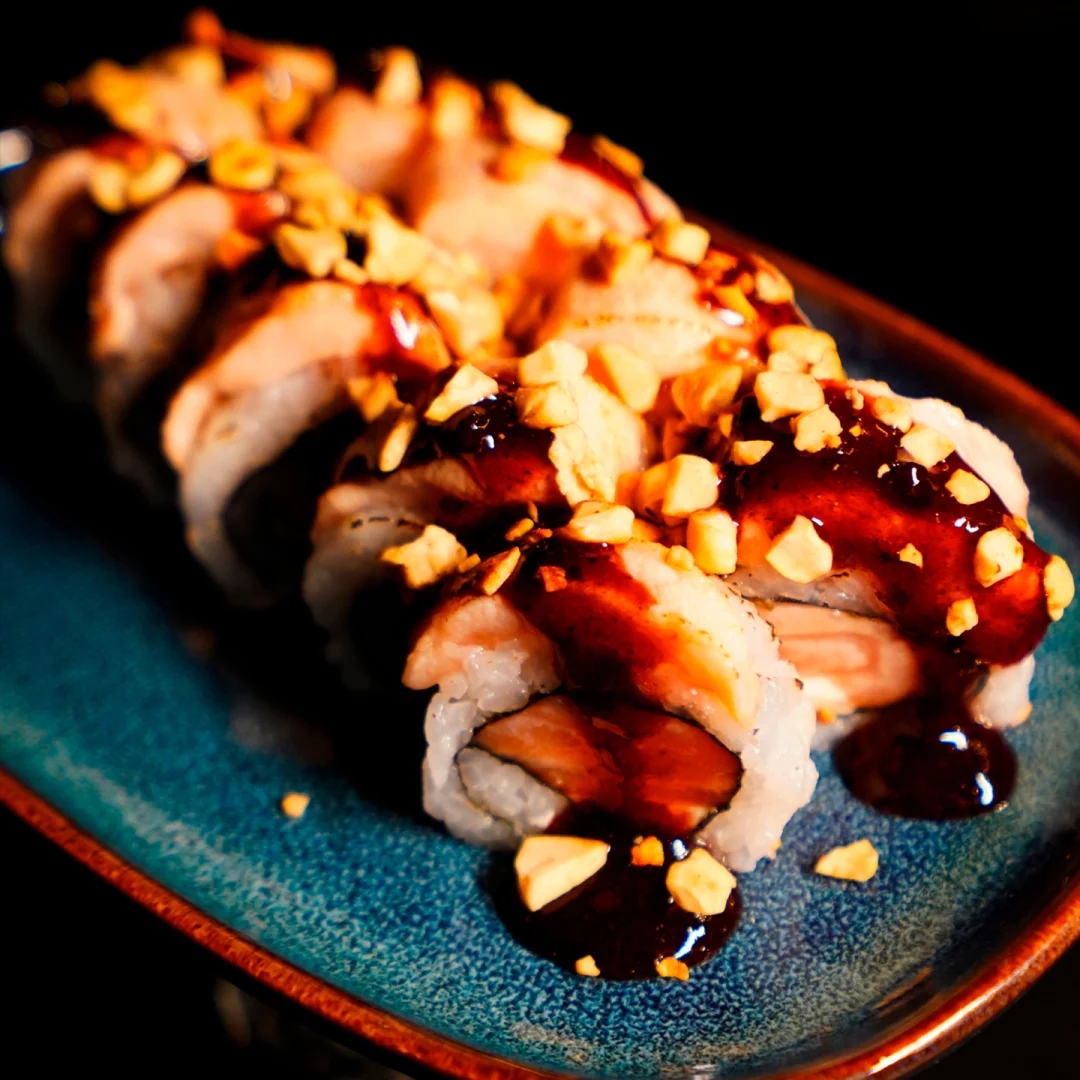 Uramaki recheado com salmão grelhado com especiarias, cream cheese e finalizado com molho tarê e gergelim